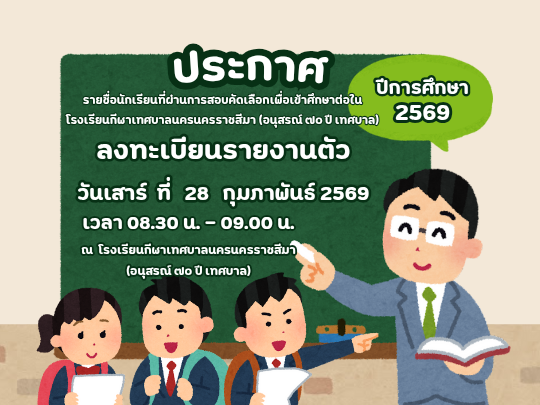 ประกาศรายชื่อนักเรียนที่ผ่านการสอบคัดเลือกเพื่อเข้าศึกษาต่อใน โรงเรียนกีฬาเทศบาลนครนครราชสีมา (อนุสรณ์ ๗๐ ปี เทศบาล)ประจำปีการศึกษา 2569 25 ก.พ. 69