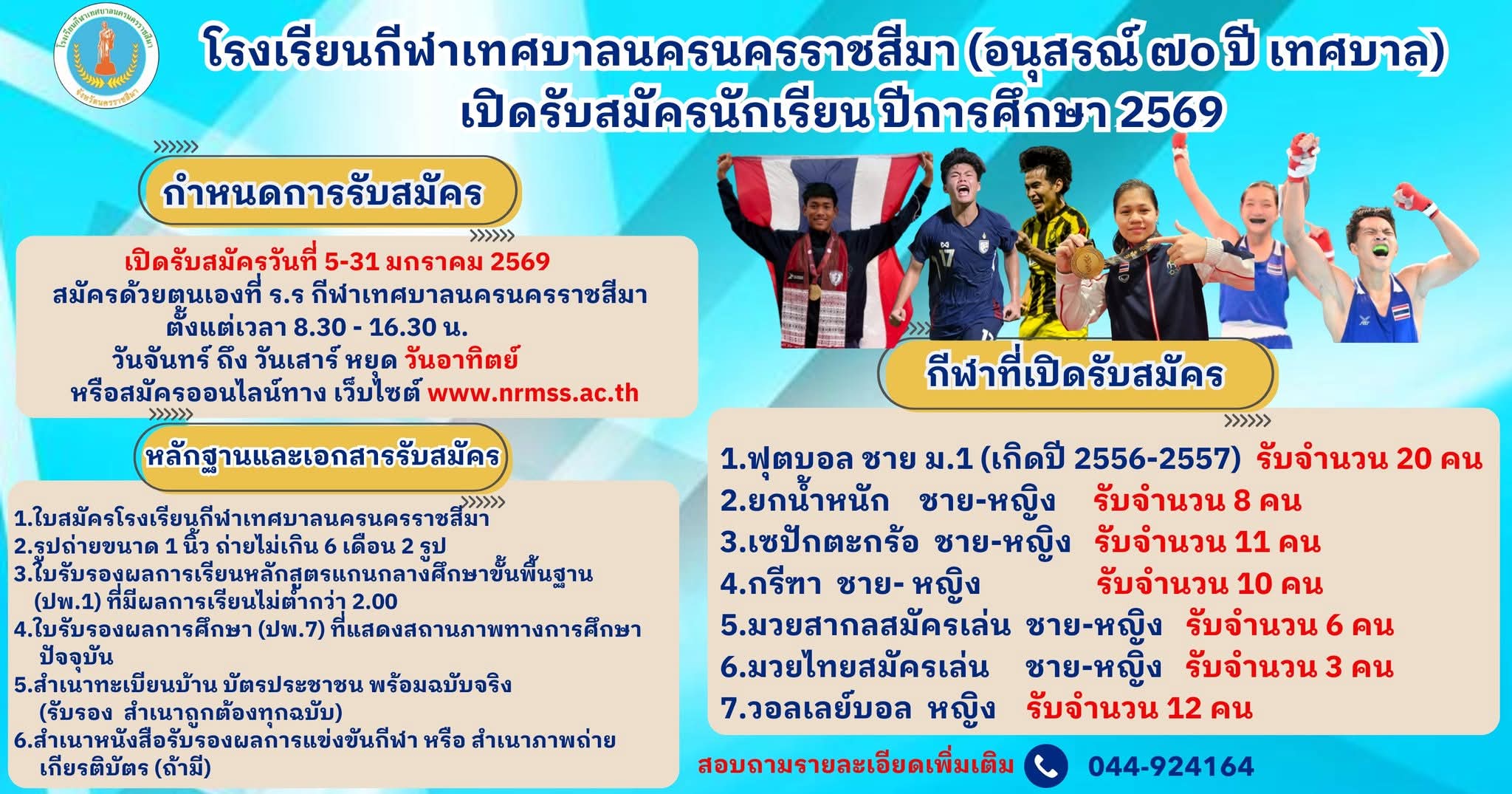 ประกาศเปลี่ยนแปลงกำหนดการรับรายงานตัวนักเรียนที่ผ่านการสอบคัดเลือกและมีสิทธิ์เข้าศึกษาต่อ ณ โรงเรียนกีฬาเทศบาลนครนครราชสีมา (อนุสรณ์ ๗๐ ปี เทศบาล) ปีการศึกษา 2567 เป็นวันเสาร์ ที่ 2 มีนาคม 2567 ทุกชนิดกีฬา 07 ก.พ. 67